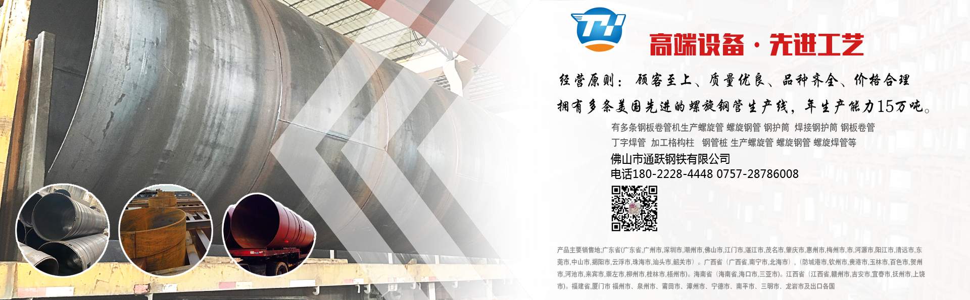 佛山市通躍鋼鐵有限公司 電話180-2228-4448 0757-28786008 擁有多條美國先進的螺旋鋼管生產(chǎn)線,生產(chǎn)直徑φ159-φ3620mm(壁厚6mm-20mm)的雙面埋弧螺旋焊鋼管,年生產(chǎn)能力15萬噸。 生產(chǎn)螺旋管 螺旋鋼管 螺旋焊管 規(guī)格厚度6mm-20mm 直徑159mm-3620mm 有多條鋼板卷管機生產(chǎn)規(guī)格厚度6mm-70mm 直徑400mm-5020mm 螺旋管 螺旋鋼管 鋼護筒 焊接鋼護筒 鋼板卷管 丁字焊管 加工格構柱 鋼管樁 材質Q235B Q345B Q235A 45# 20# Q420D Q390··· ……